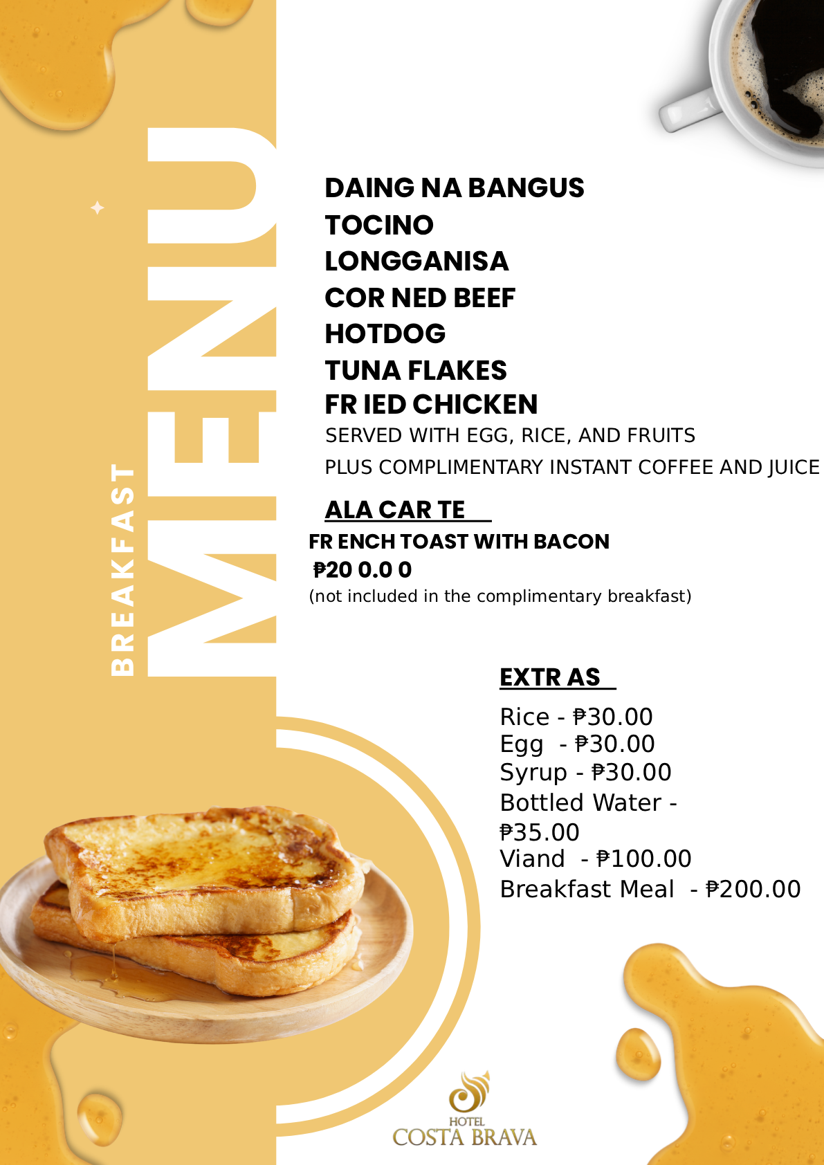 | +63 919 060 7784 | (053) 832 - 7557 | Hotel Costa Brava Address: Airport Road Brgy. 88, San Jose, Tacloban City, Leyte Philippines